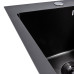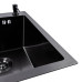 The sink body is made of SUS 201 stainless steel with a durable black PVD coating and a honeycomb-textured surface that combines decorative appeal with increased rigidity and additional protection against minor mechanical damage. The reinforced top rim is 3 mm thick, providing structural stiffness and installation stability, while the 0.8 mm thick walls and bottom maintain an optimal balance between strength and weight. The textured finish reduces the visibility of water marks and light soiling, and the coating protects the metal from discoloration, scratches, and deposits.