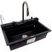 - Інтегрований змішувач — ідеально вписується в дизайн мийки. Виконаний з висувним носиком, на якому передбачено перемикач душ/звичайна струя і кнопка подачі потужного потоку для більш ефективного видалення твердих забруднень. Гусак поворотний на 360 градусів.
